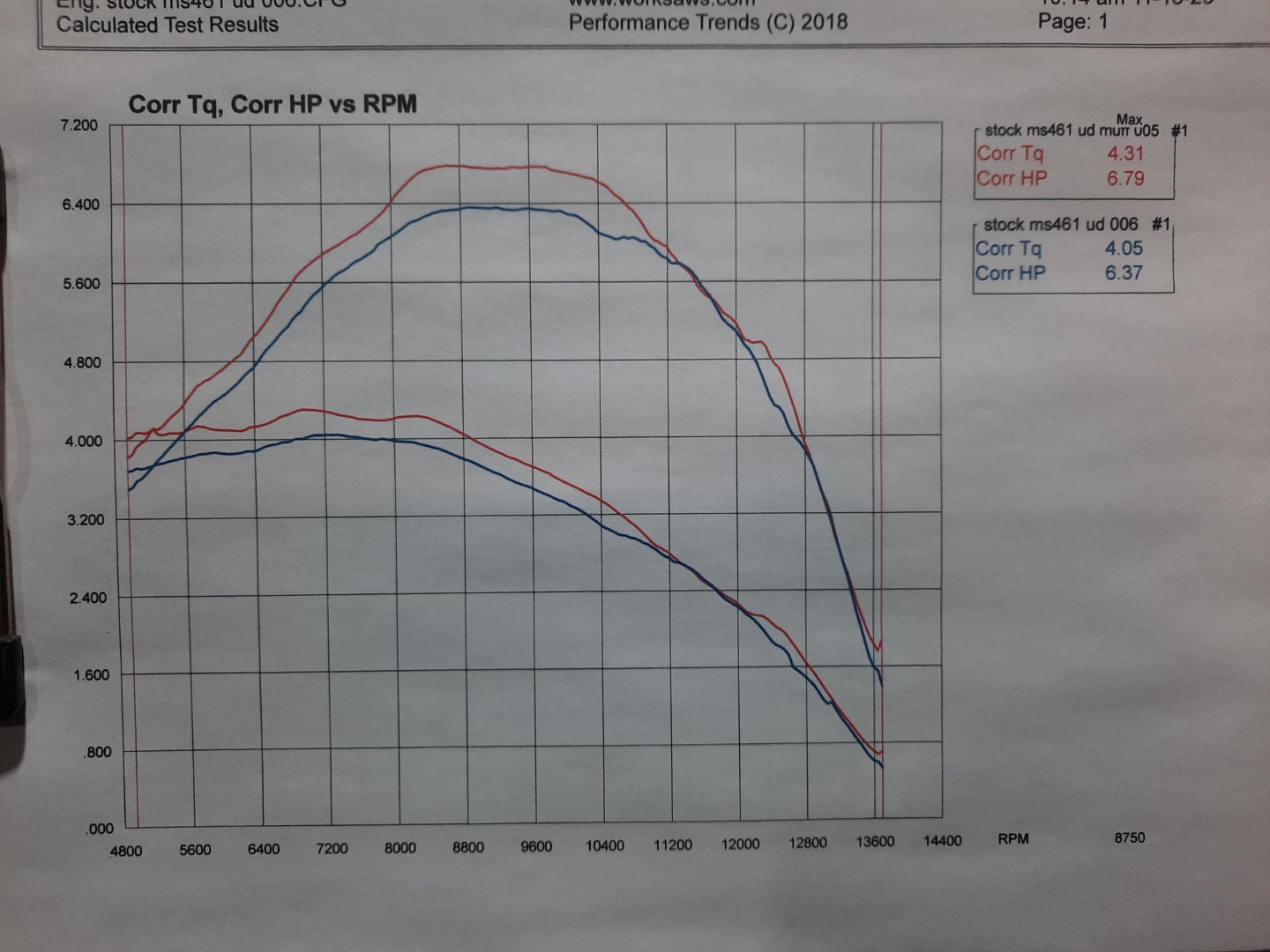 Tested on a completely stock saw with no modifications other than the muffler cover. Results showed a 6.60% increase in horsepower, and a 6.42% increase in torque. Performance gains will vary depending on the saw and the level of modification.