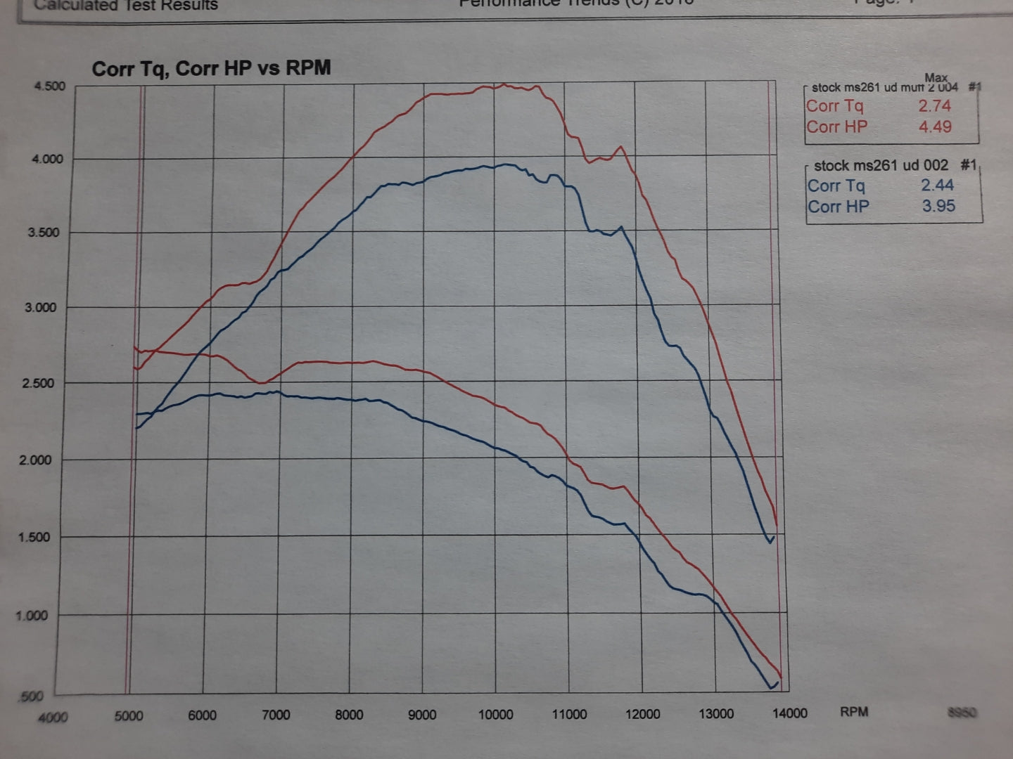 Tested on a completely stock saw with no modifications other than the muffler. Results showed a 13.70% increase in horsepower and a 12.30% increase in torque.